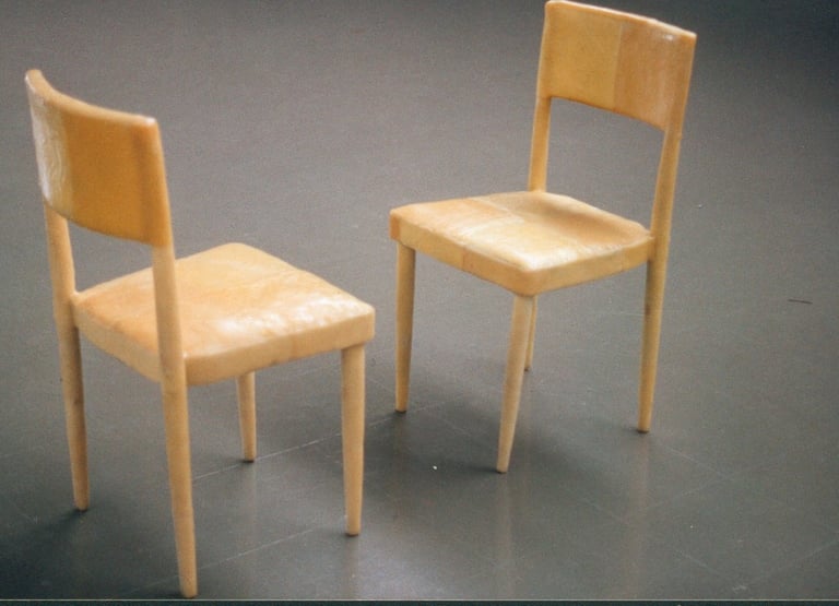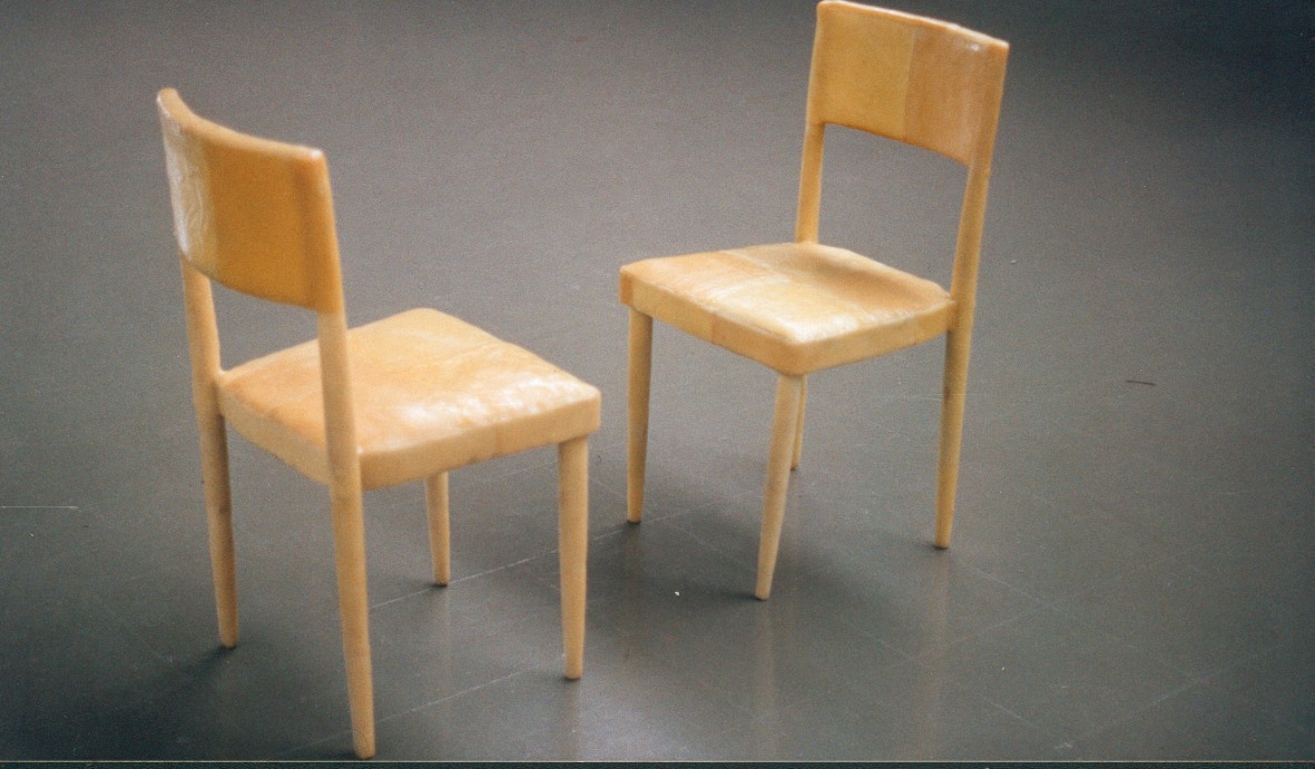 Dos sillas viejas, usadas, cubiertas de cera de abeja, colocadas en una posición de diálogo. Las sillas contienen la vida de las personas que se sentaron en ellas a comer, conversar, llorar… La cera conserva estas experiencias y la posición acentúa su carácter humano. La fragilidad de la cera (quebradiza, licuable) habla de lo complicadas que pueden ser las relaciones humanas.